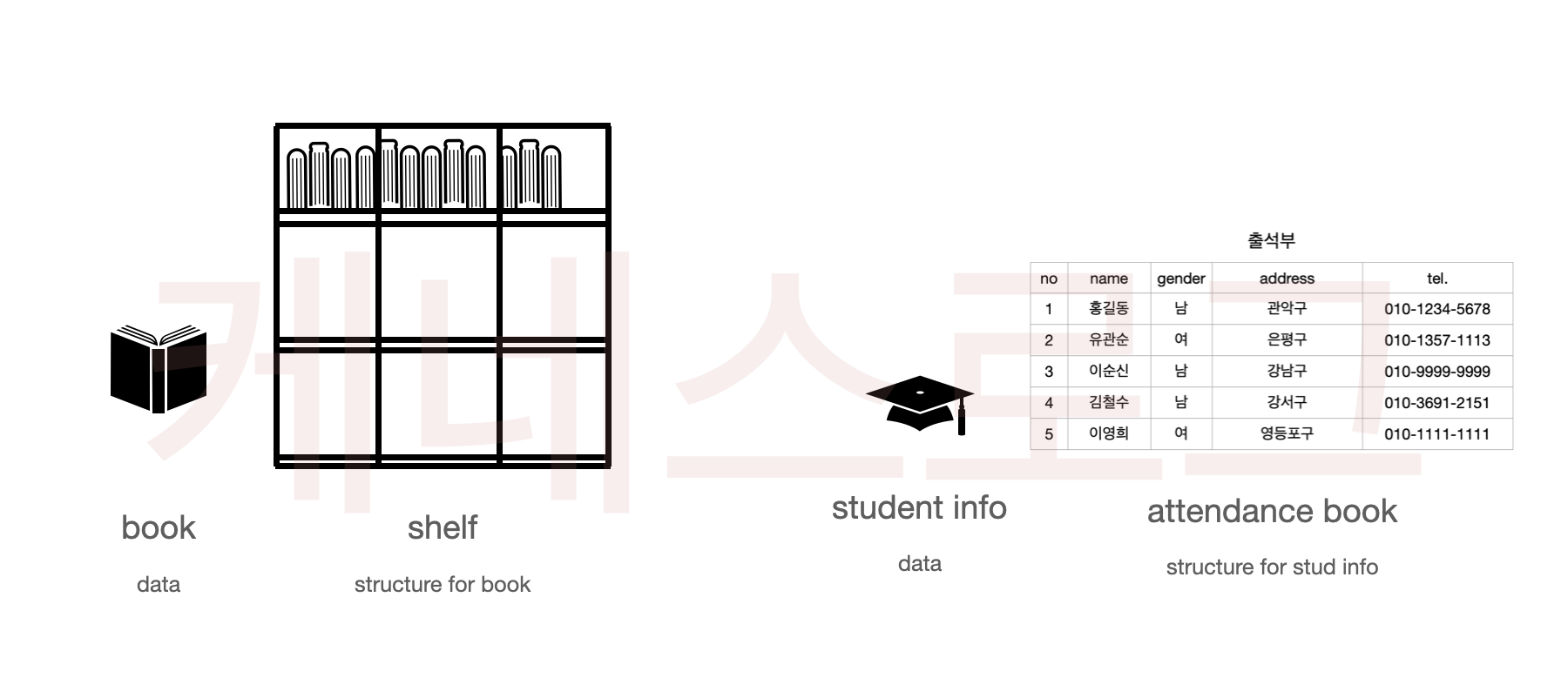 학생들의 이름 순으로 정리된 출석부도 배열이라고 할 수 있습니다. 출석부엔 학생번호(index)가 순서대로 기입되어 있으며, 학생번호(인덱스)를 통해서 특정 학생의 정보를 조회할 수 있습니다.