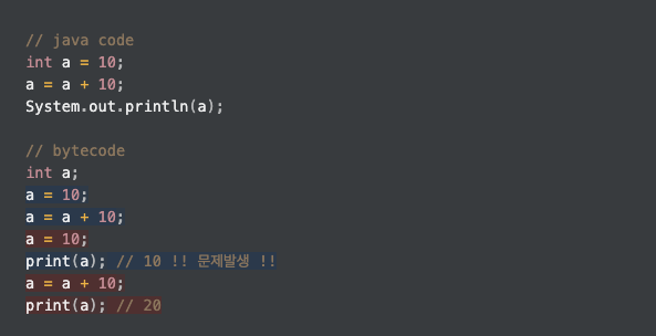 위의 예시에서 a를 선언하고 할당했습니다. 우리는 한줄의 코드로 작성했지만, 바이트코드 상으로는 2줄로 표현됩니다.