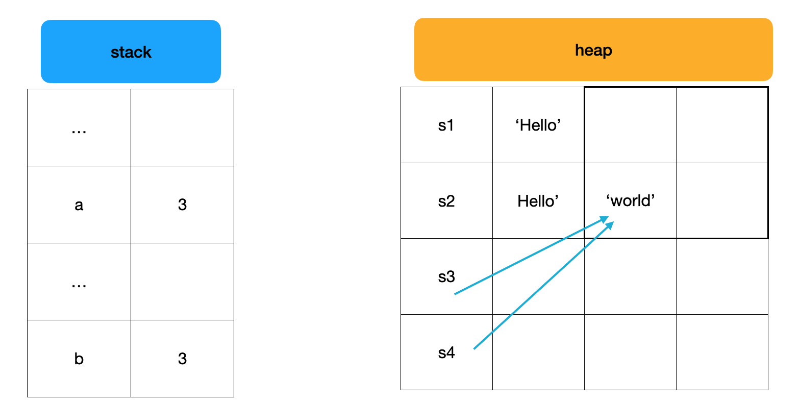 CASE 2에서는 메모리 공간에 위치한 “world”라는 문자열을 둘 다 가리킵니다. 따라서, 둘을 비교하면 true를 반환하게 됩니다.