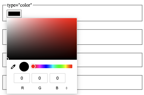 color타입의 <input>은 색상을 선택하기 위한 UI가 제공됩니다. 직접 색상을 포인터를 통해 정하거나 코드값을 통해 지정할 수 있습니다.