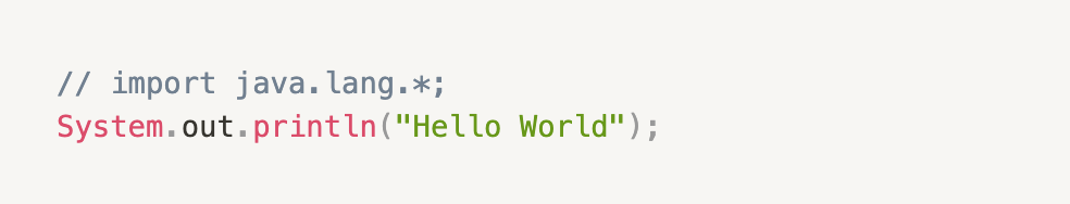 위의 간단한 Java 프로그램을 만들었다. 위의 명령 중 println()이라는 메소드를 실행하기 위해서 해당 메소드는 분명 어딘가 정의되어있어야만 한다. 하지만, 우리는 저런 메소드를 정의한적이 없고, 다른 라이브러리(패키지)를 import한 적도 없다. 분명, System이라는 패키지가 import되어야만 실행이 가능한 문장이다.
