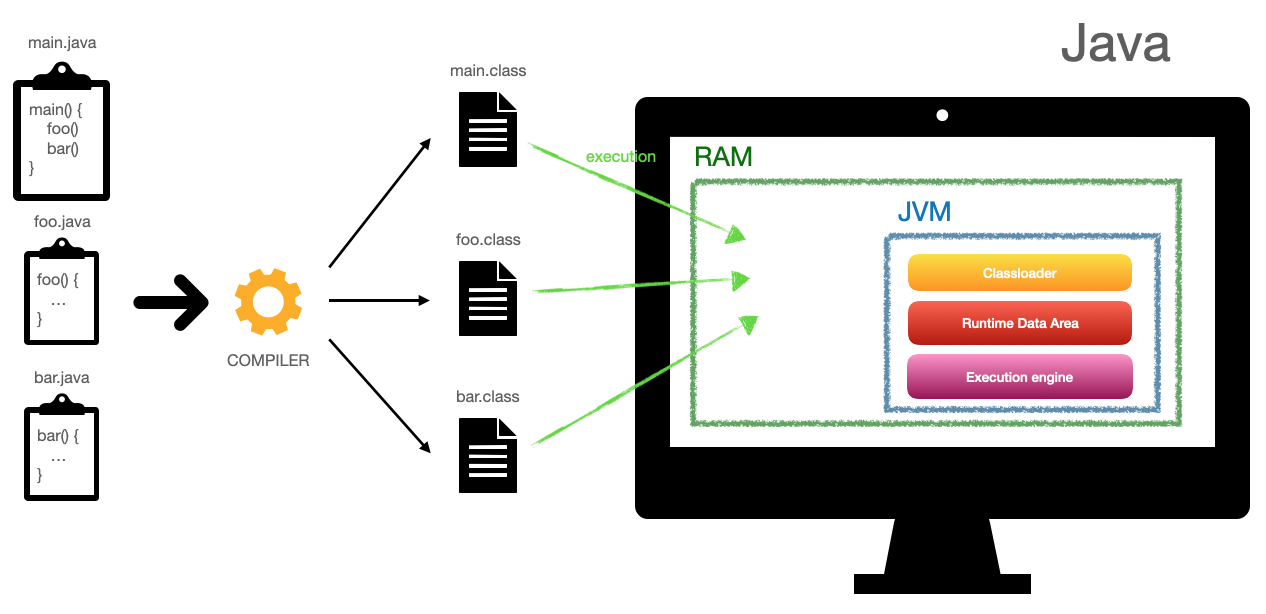 Java언어로 작성된 소스코드는 .java형식의 파일로 저장된다. 이 .java파일은 자바 컴파일러에 의해 .class형식의 자바 바이트코드 파일로 변환된다. .class 파일의 바이트코드는 JVM에 의해 각 OS가 실행할 수 있는 기계어 형식으로 전달된다.