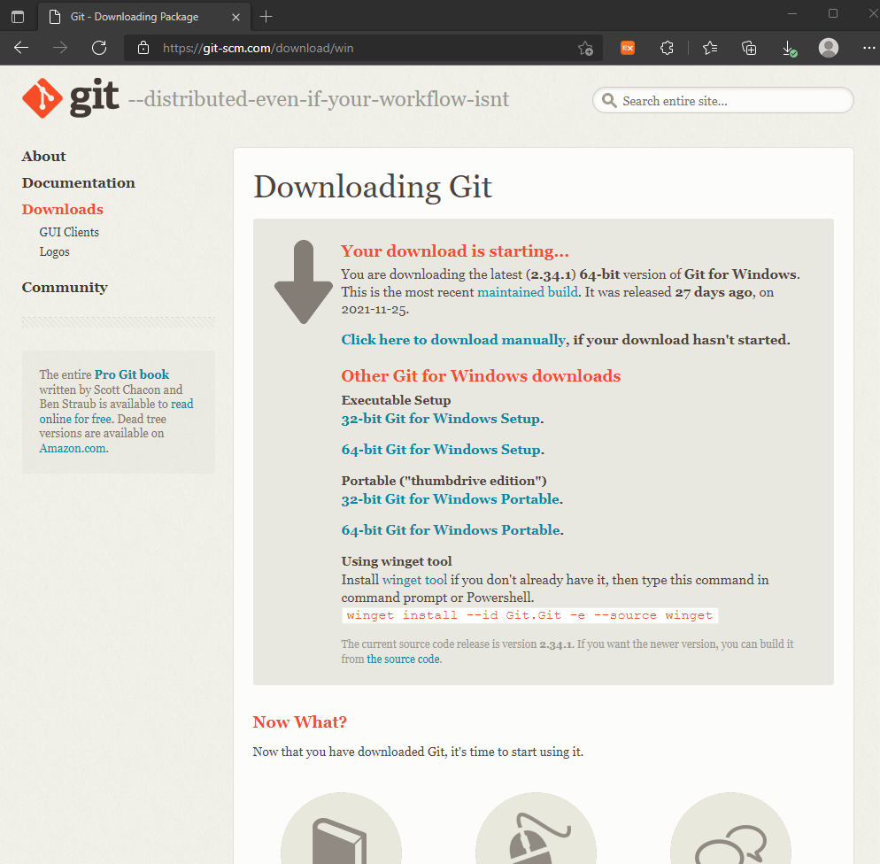 Git 홈페이지(이곳)에서 직접 다운로드할 수 있습니다. Windows에서는 Homebrew같은게 있는지 잘 모르겠어서.. 찾아본 결과 대부분 공식 홈페이지에서 다운로드를 하더군요. 어쨋든, 홈페이지로 이동하여 본인의 윈도우 환경에 맞는 다운로드 파일을 다운받아줍니다.